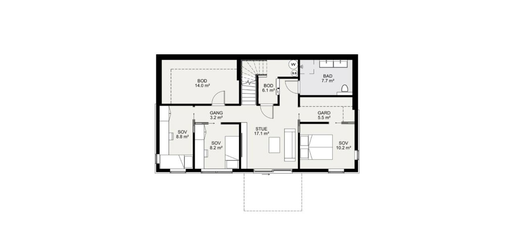 Inngangspartiet er overbygd og har praktisk direkte tilgang til vaskerommet. Boligen har totalt 3 soverom, og et stort, lyst og åpent fellesområde delt inn i flere soner.