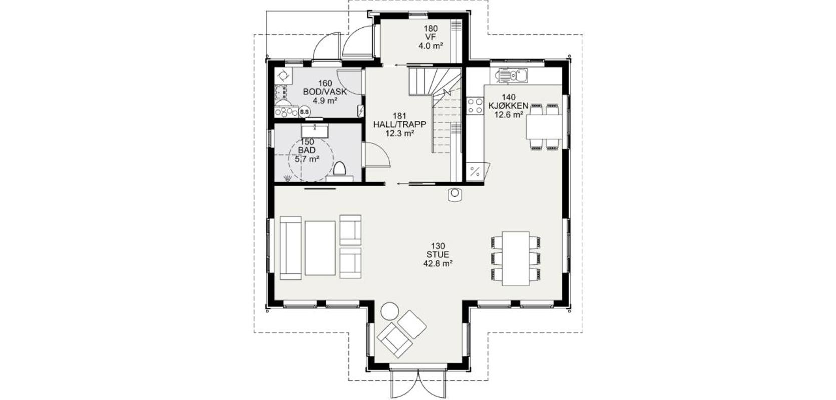 Hovedinngangen leder inn til en romslig hall. Fra hallen finner du vaskerom og bod lett tilgjengelig, et bad og trapp opp til andre etasje. Herfra trer du også inn til husets romslige oppholdssone med stue og kjøkken.